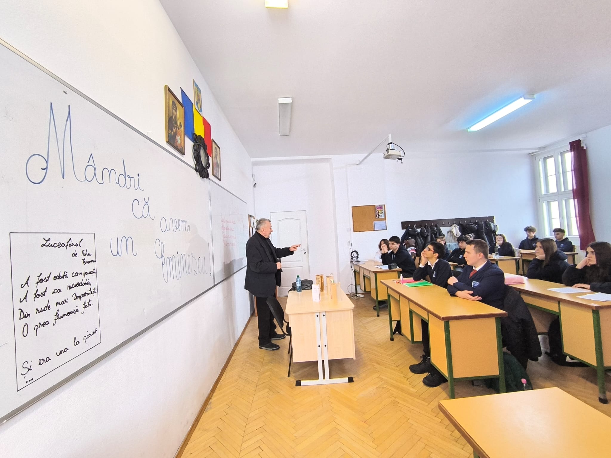 Elevii clasei a IX-a A, îndrumați de dna prof. Ioana Sarca, au avut parte de o veritabilă „întâlnire de suflet”. Invitatul special al acestui eveniment a fost cunoscutul scriitor și eseist Ioan F. Pop, care i-a ghidat pe tineri într-o călătorie fascinantă prin universul poeziei eminesciene și al valorilor identitare românești. Activitatea a fost marcată de un dialog deschis, iar atmosfera a fost una caldă, lăsând în urmă dorința de a deschide mai des volumele de poezie.